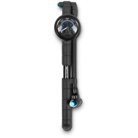 Bomba de respiración con cabezal de válvula Schrader de 2 etapas para un desenroscado seguro sin pérdida de aire. Gracias al mango ergonómico Natural Fit , la bomba se adapta perfectamente a la mano y permite un ajuste perfecto de la suspensión con el manómetro de precisión y la válvula de descarga de aire.